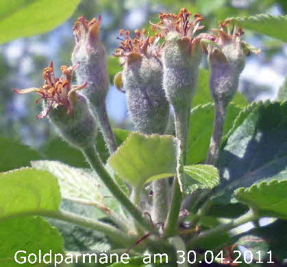 unregelmäßiger Blütenansatz / mittel bis spät (2011 ab 10. April / 2012 ab 21. April / 2013 ab 5. Mai / 2014 ab 6. April / 2015 ab 21. April / 2018 ab 20. April ), lang andauernd, mittlere Frostempfindlichkeit / Alkmene, Berlepsch, und andere ... |