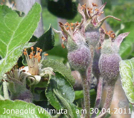 triploid, schlechter Pollenspender / früh, länger anhal- tend, frostempfindlich (2011, Anfang - Mitte April / 2012 ab 17. April / 2013 ab 3. Mai / 2014 ab 5. April / 2015 ab 20. April / 2017 ab 7. April / 2018 ab 17. April / 2020 ab 11. April), / Cox, Elstar, Goldparmäne, James Grieve, ..... |